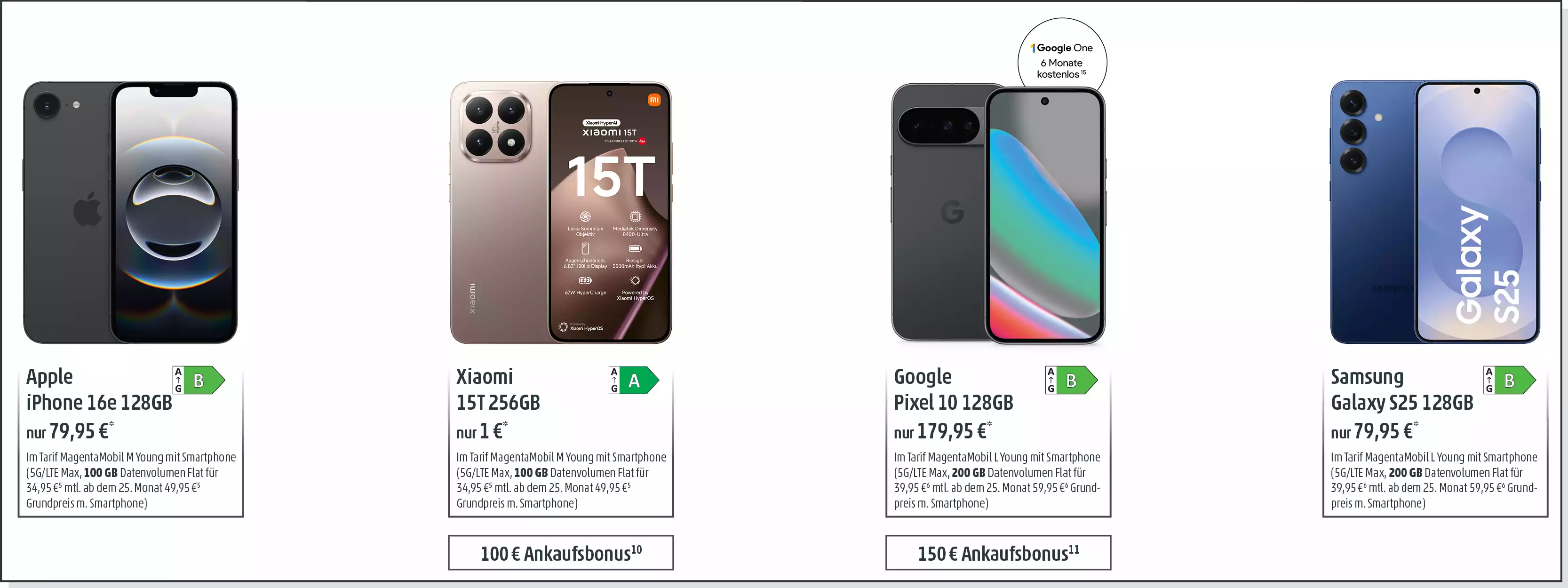 * Gilt nur in Verbindung mit einem Neuvertrag (24 Monate Laufzeit) und in den abgebildeten Endgeräte- und Tarifkombinationen vom 01.11. bis 30.11.2025, wenn nicht anders vermerkt oder solange der Vorrat reicht. Druckfehler, Irrtümer und Liefermöglichkeiten vorbehalten. Alle Preise in Euro, inkl. 19% MwSt. Bereitstellung der Angebote durch den teilnehmenden Fachhändler.