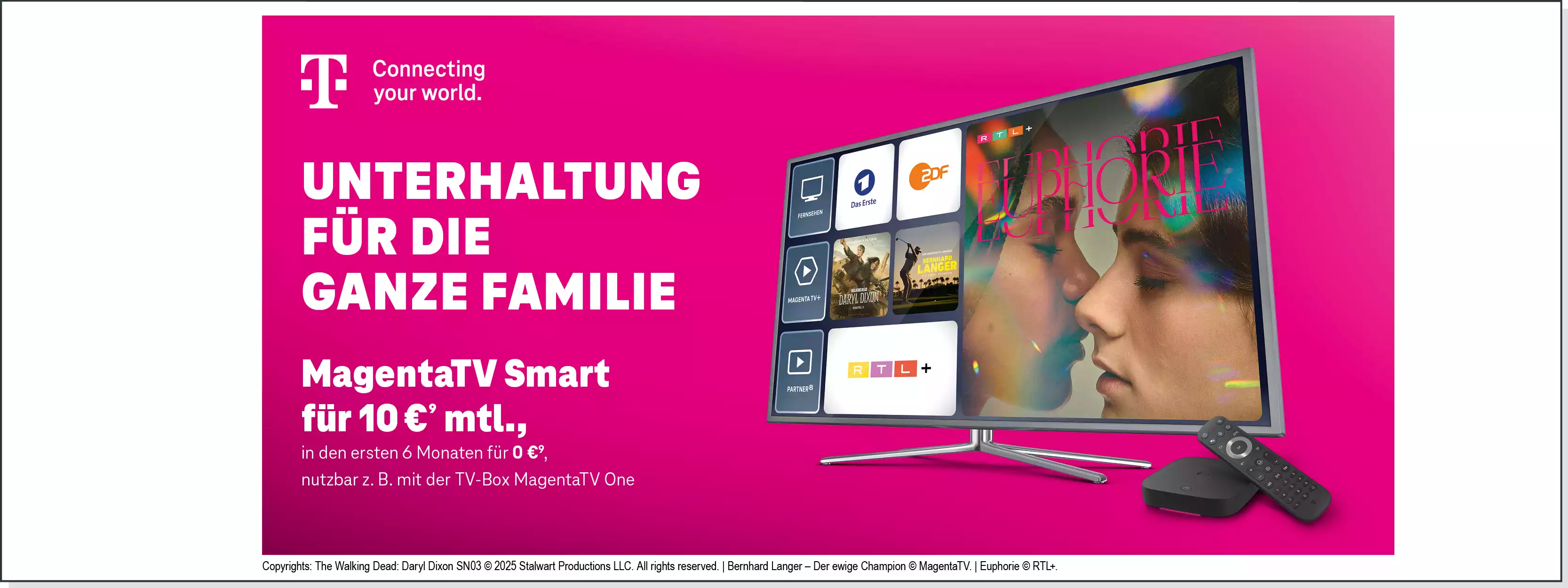 9) Aktion gilt bis 02.02.2026 für MagentaTV Neukunden. MagentaTV Smart kostet in den ersten 6 Monaten 0 €/Monat, danach 10 €/Monat. Mindestvertragslaufzeit 24 Monate. MagentaTV ist über die MagentaTV App ohne zusätzliche Hardware empfangbar. Auf Wunsch kann die TV-Box MagentaTV One für 5 €/Monat, zzgl. 6,95 € Versandkosten, mit einer Mindestvertragslaufzeit von 12 Monaten gemietet werden. Alle Preise inkl. der gesetzlichen MwSt. Voraussetzung für die Nutzung ist eine bestehende Internetverbindung. Für die Internetverbindung gelten die Bedingungen des jeweiligen Internetanbieters. Bei Nutzung über das Mobilfunk-Datennetz erfolgt die Belastung des Datenvolumens beim jeweiligen Mobilfunk-Anbieter.